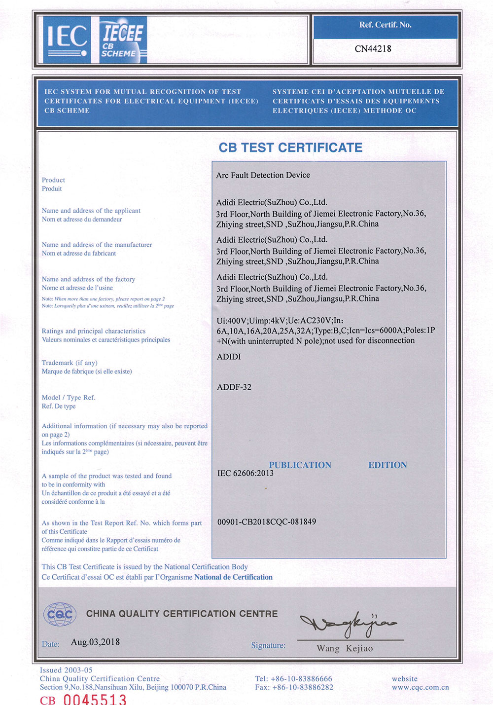 熱烈慶祝艾迪迪電氣(蘇州)有限公司于2018年8月3日首家獲得故障電弧保護器CB國際認證證書。